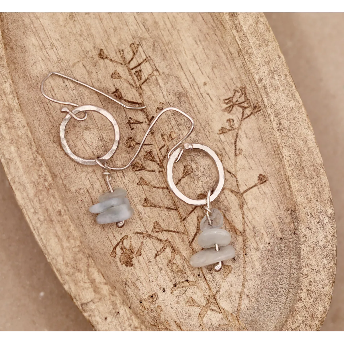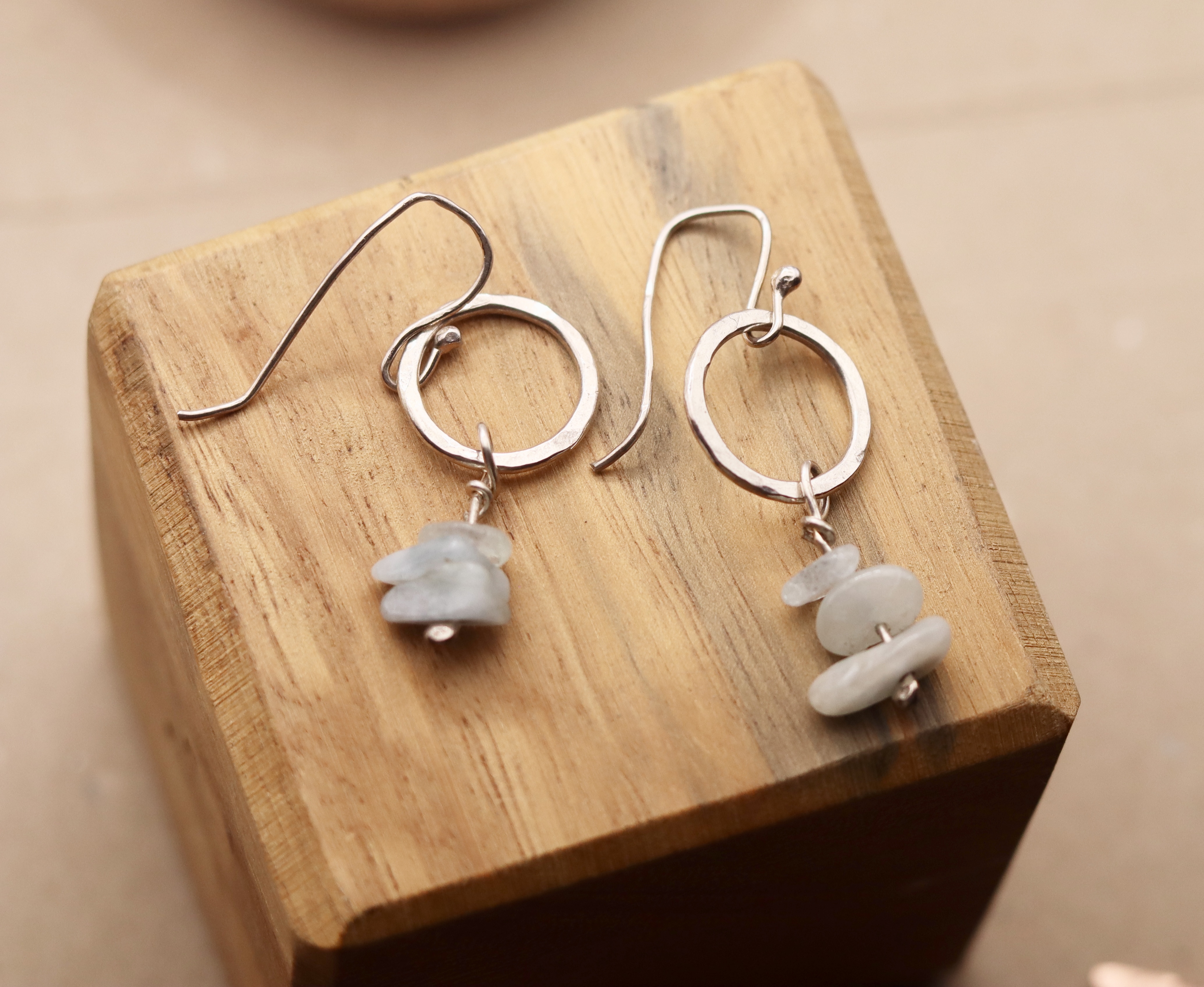 Aquamarine and hoop earrings. Dangle earrings with a hammered circle with aquamarine chips dangling on the bottom.