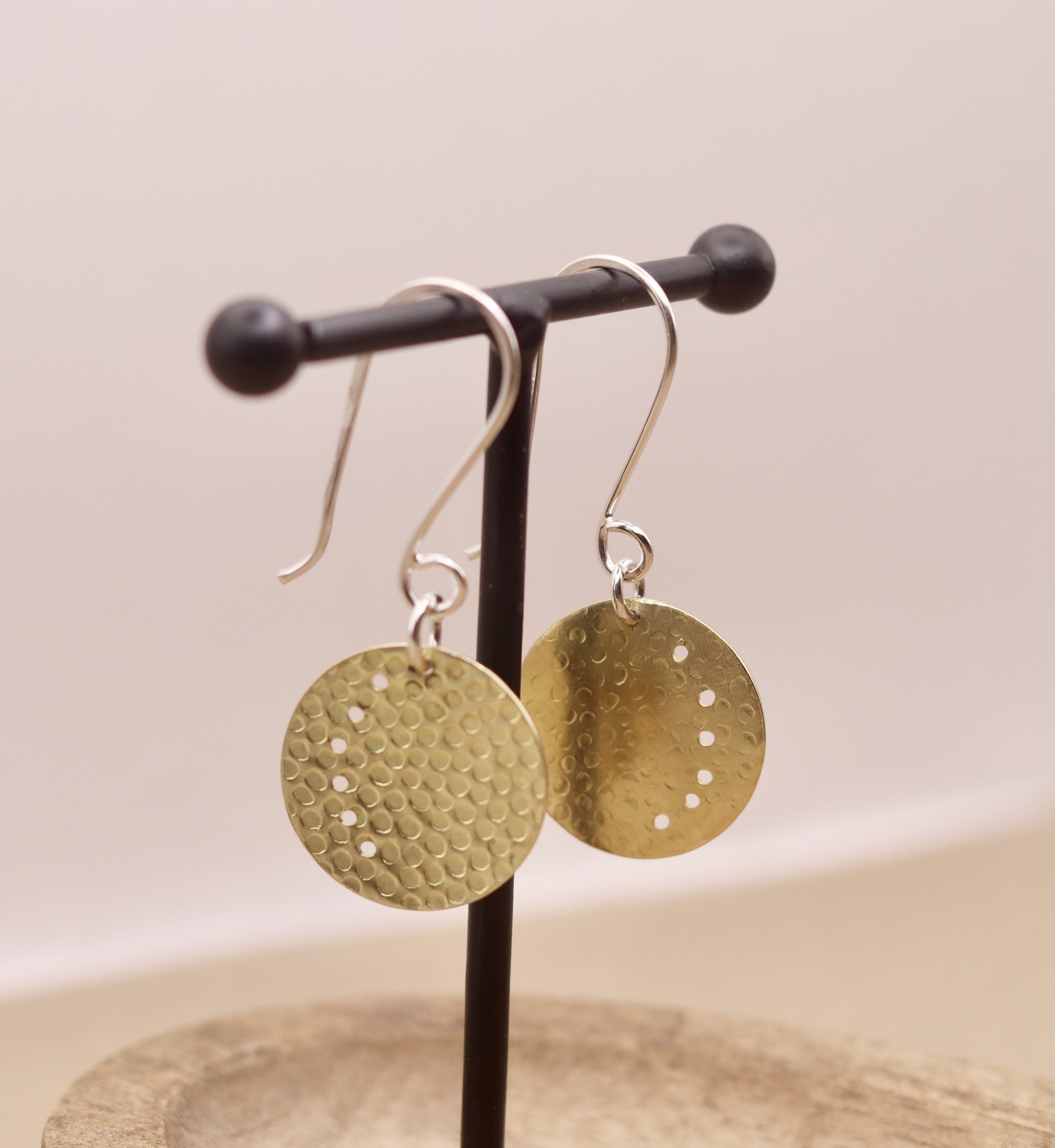 Brass circular earrings. Hanging from sterling silver ear wires.
