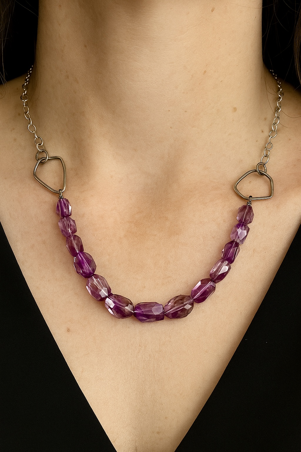 This handmade chunky amethyst and sterling silver necklace combines the bold beauty of amethyst with the sleek elegance of sterling silver. The necklace features large, geometric-shaped pieces of amethyst, each one carefully hand-shaped to highlight its natural beauty and unique hues. The amethyst stones, ranging in rich purples from light lavender to deep violet, have been meticulously cut into angular, geometric shapes, creating a striking visual contrast and adding a contemporary edge to the design.