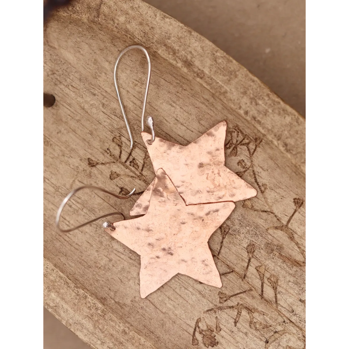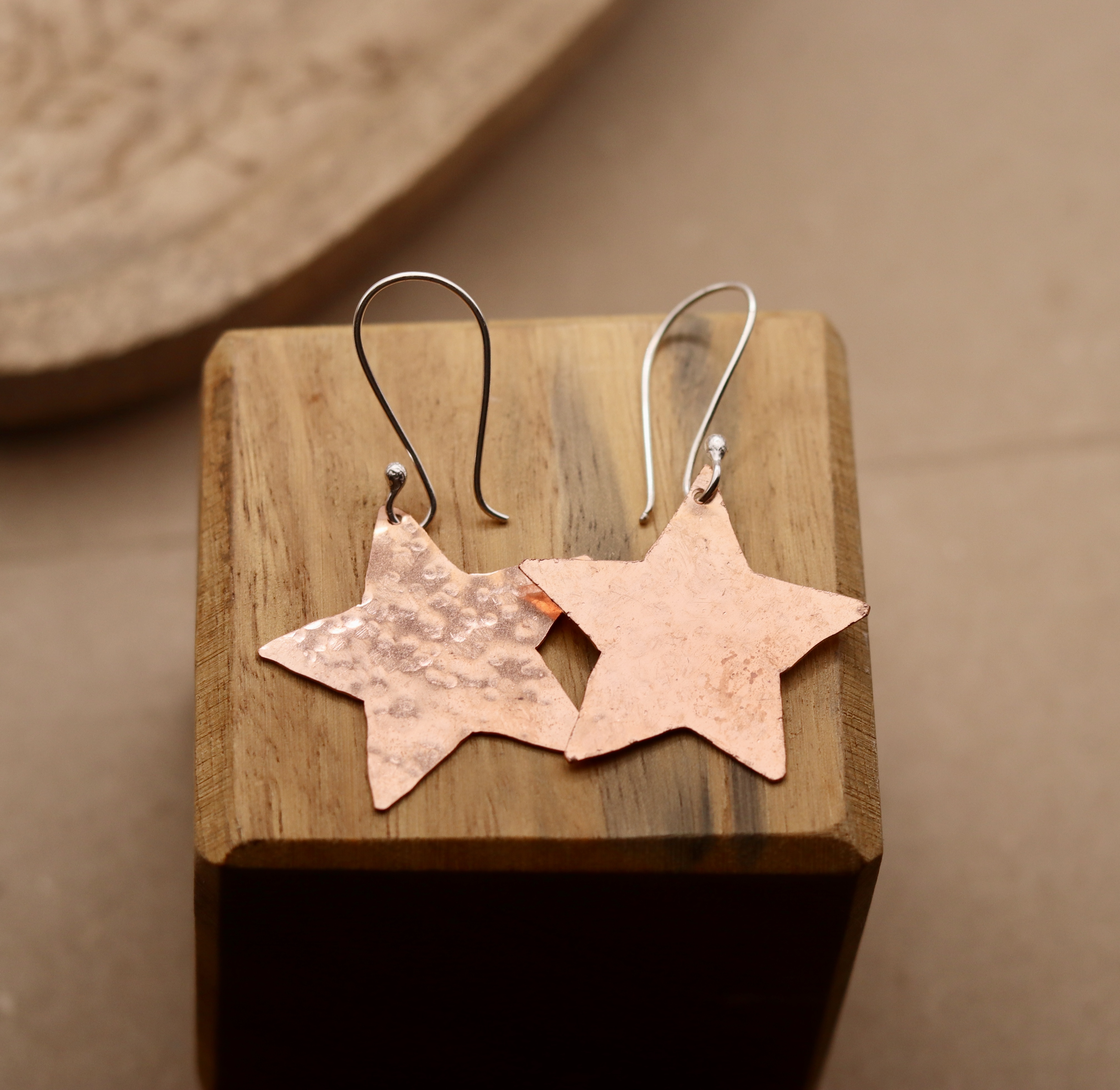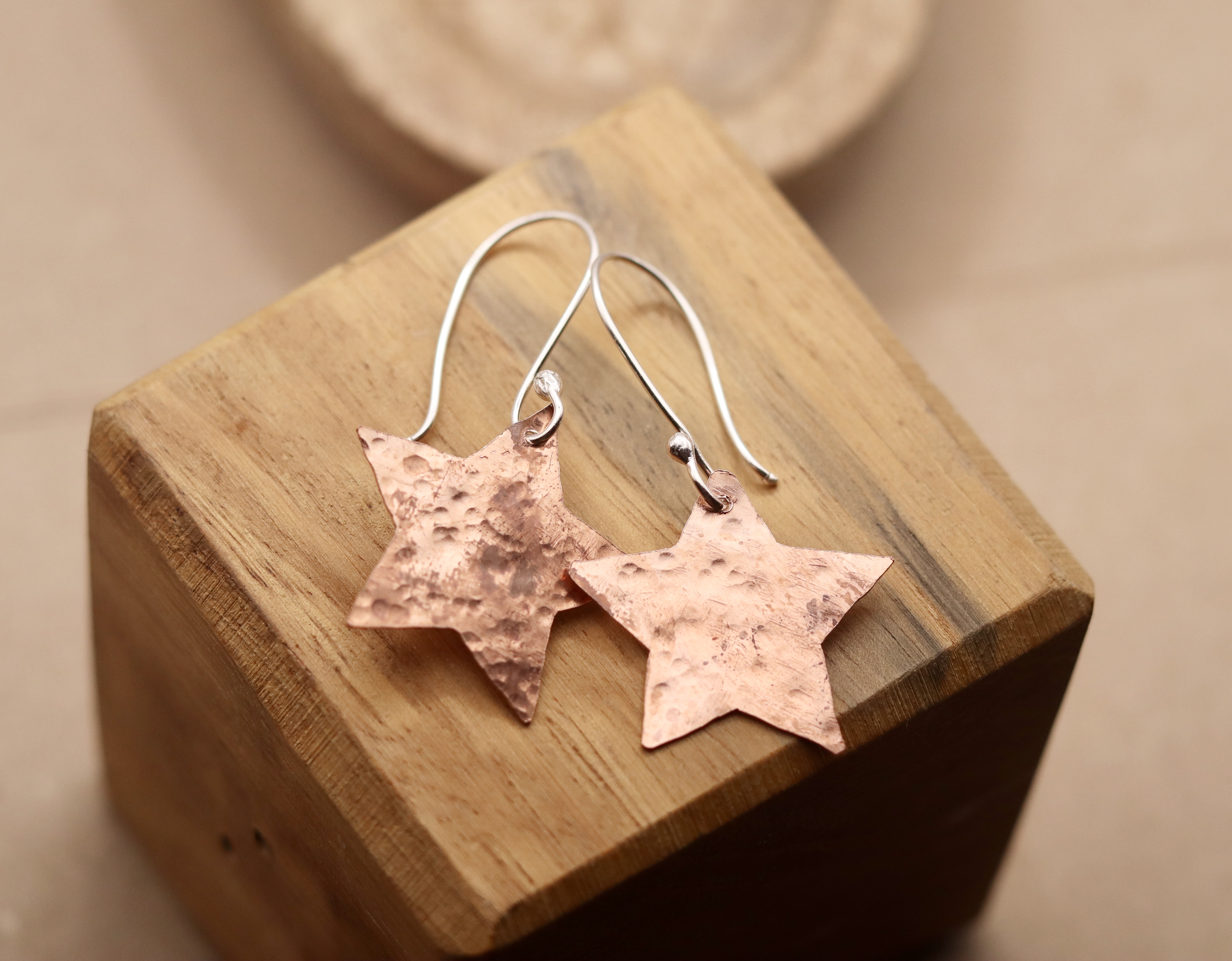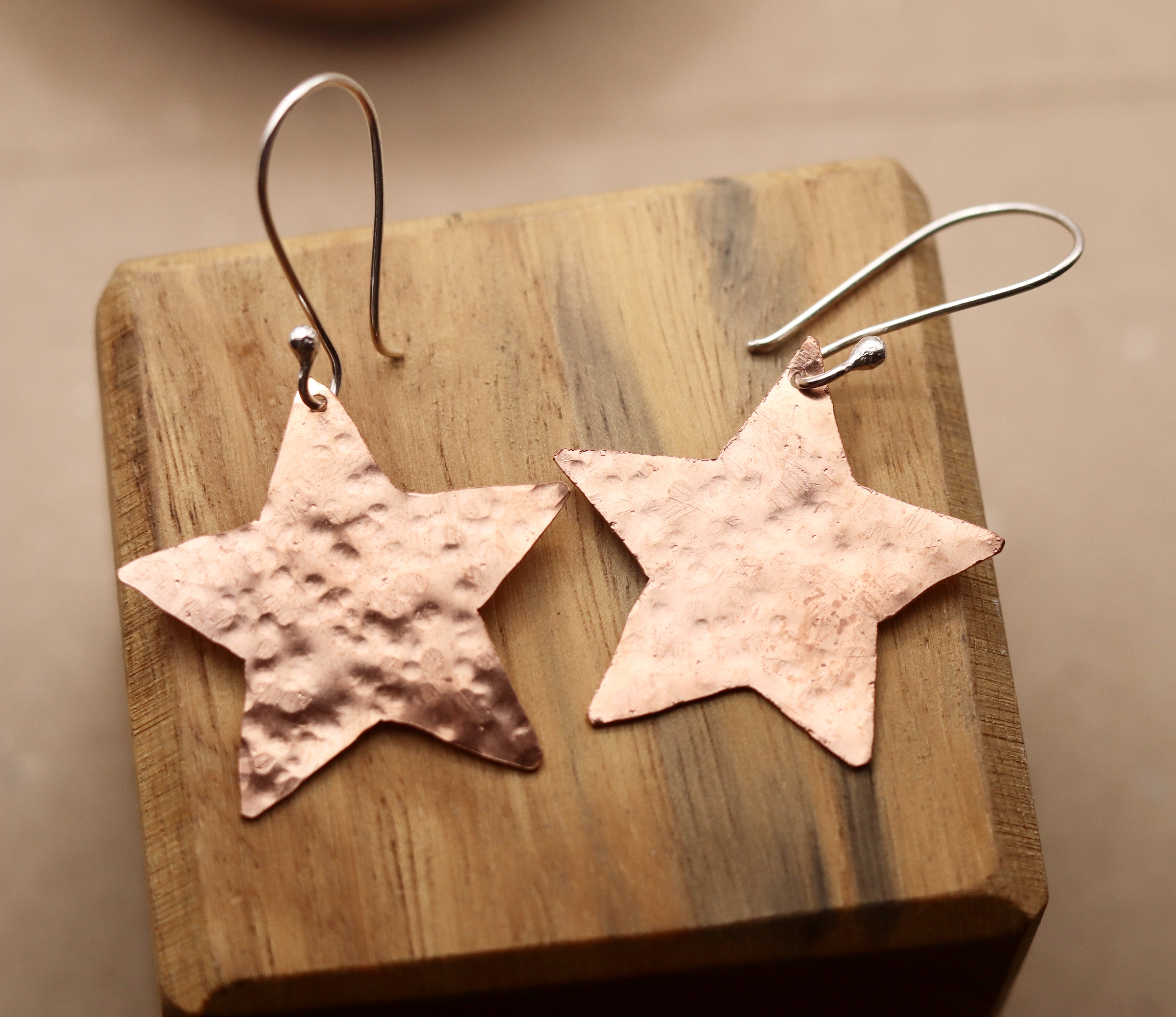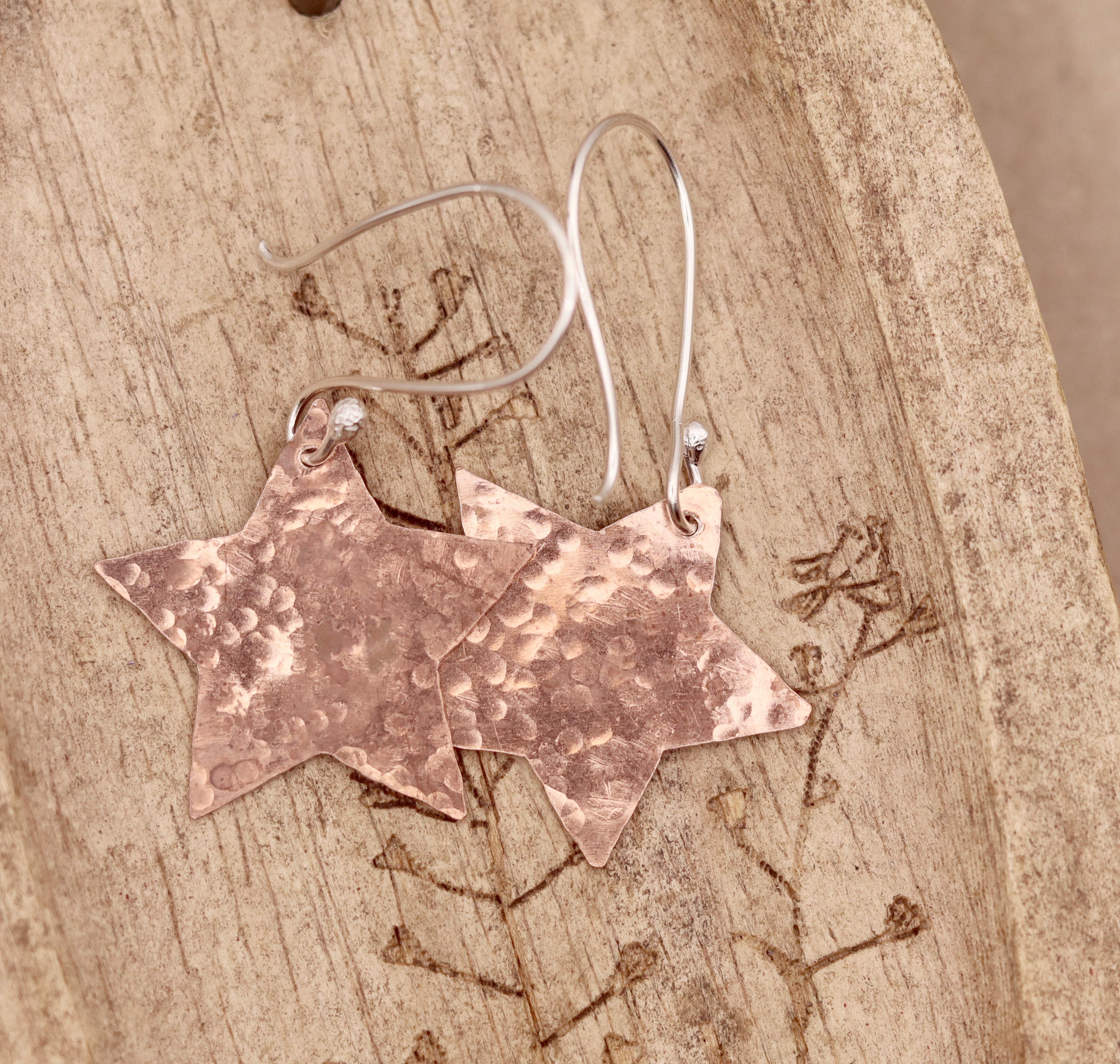 Earrings created using recycled copper which has been hammered. Hanging from sterling silver ear wires.