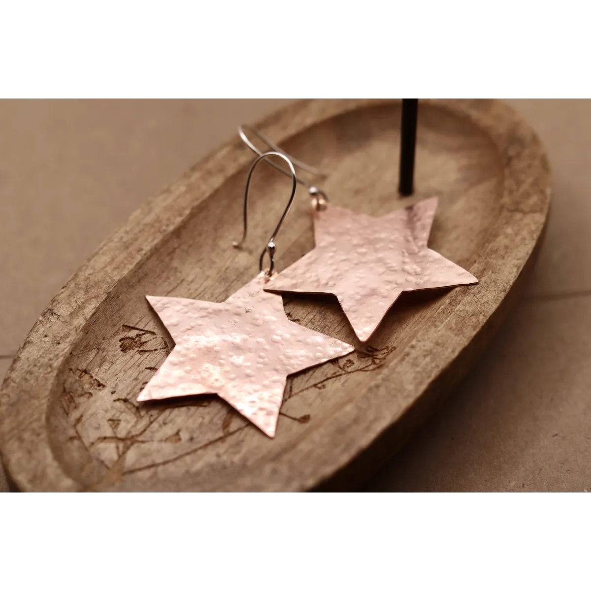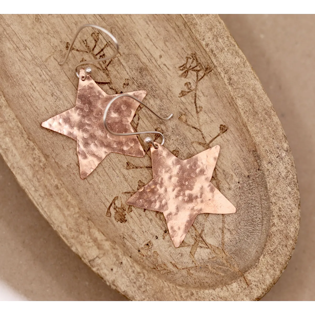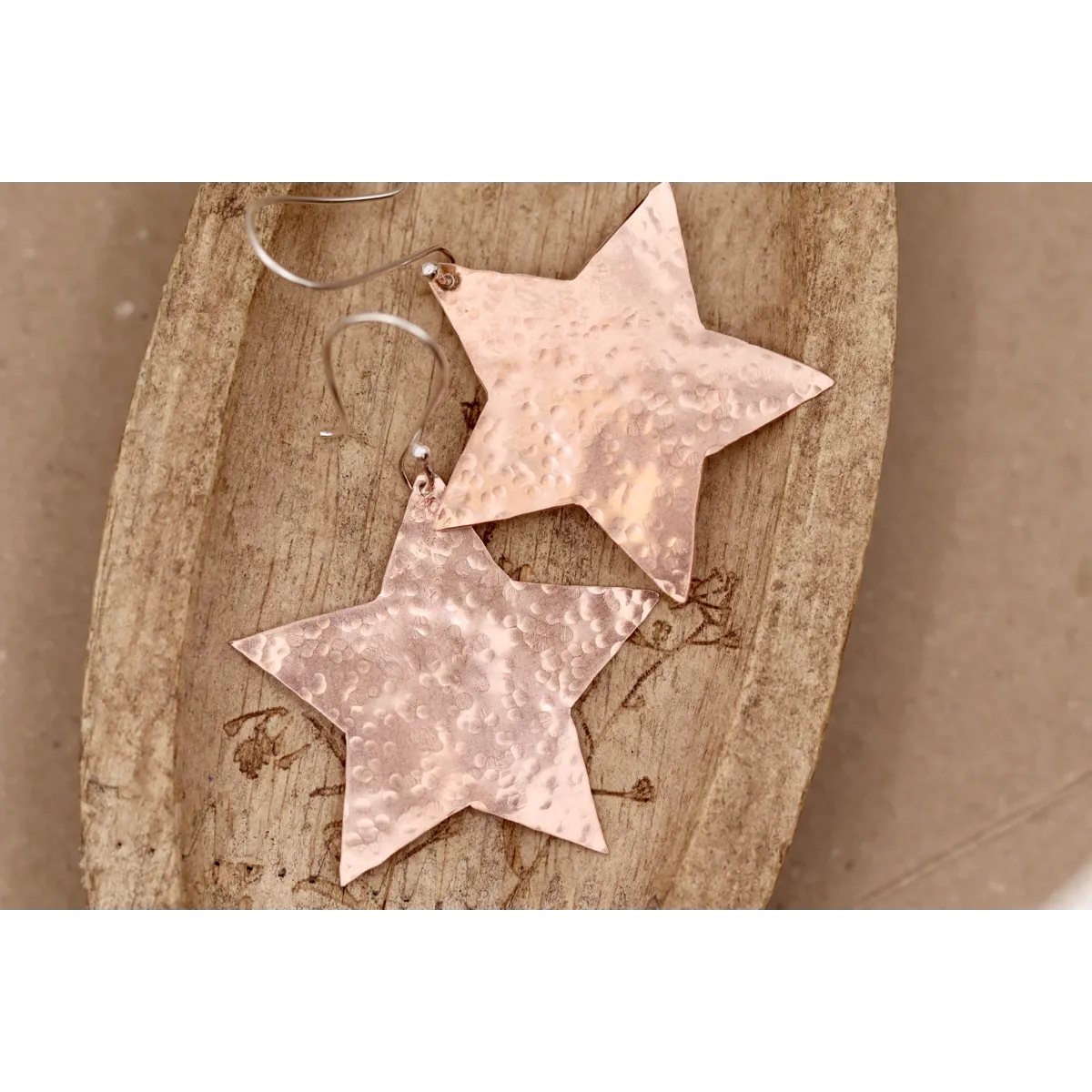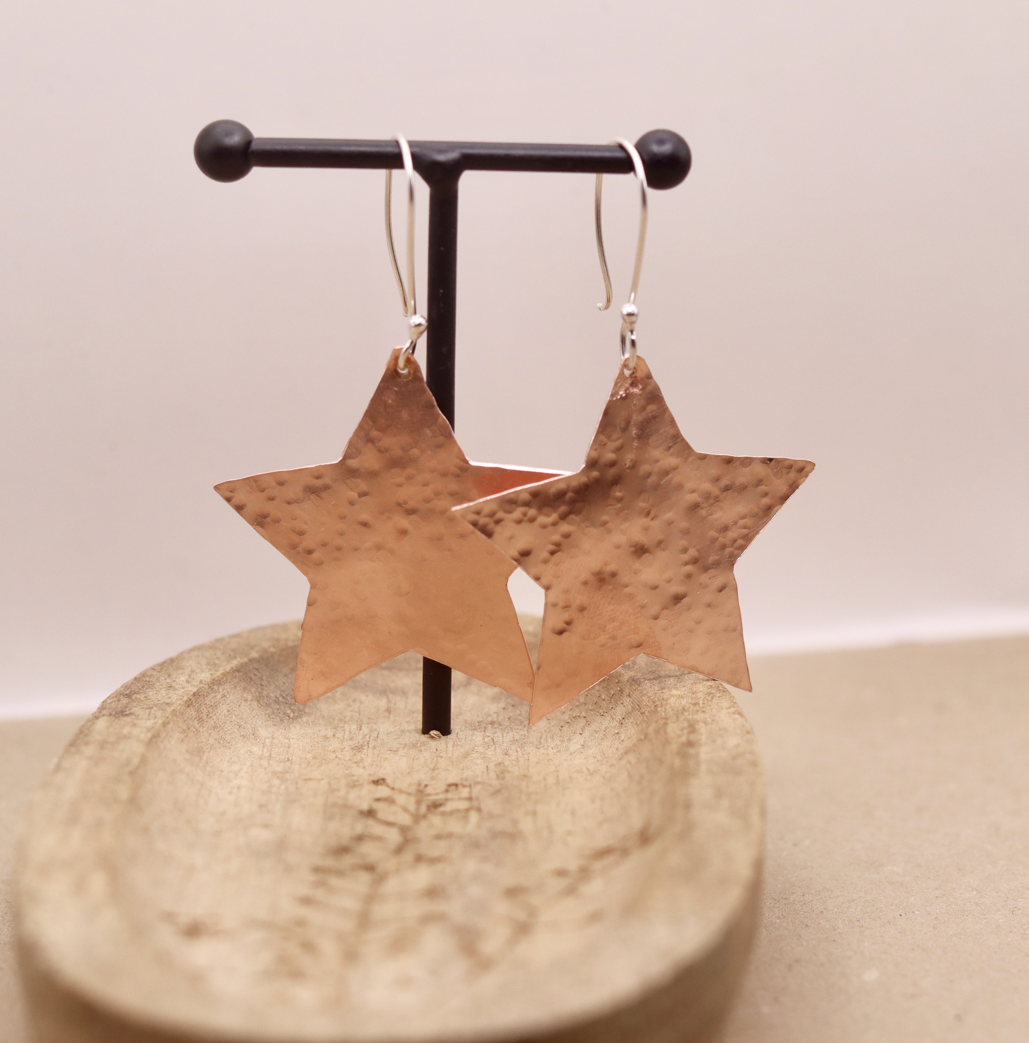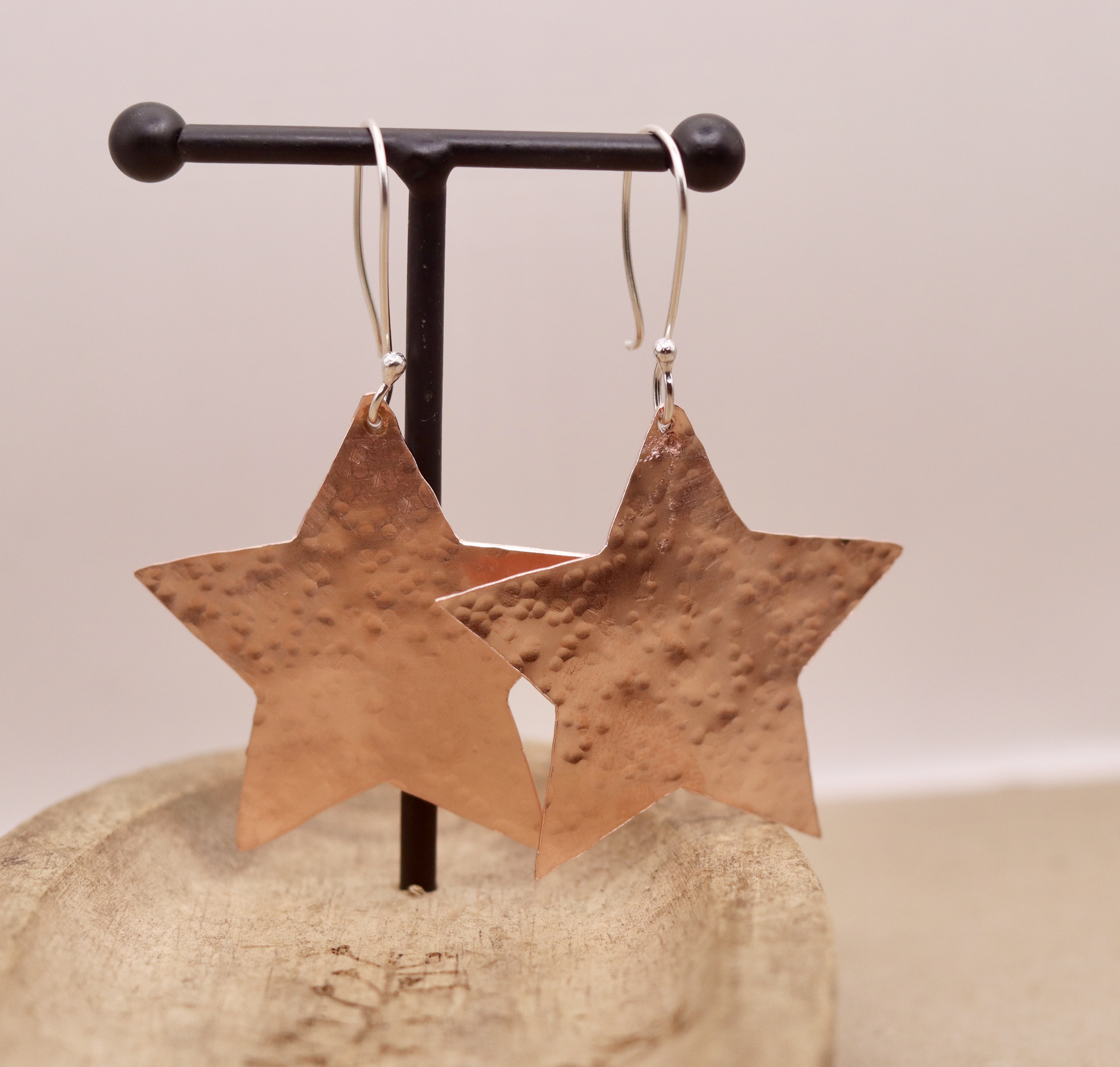 Earrings created using recycled copper which has been hammered. Hanging from sterling silver ear wires.