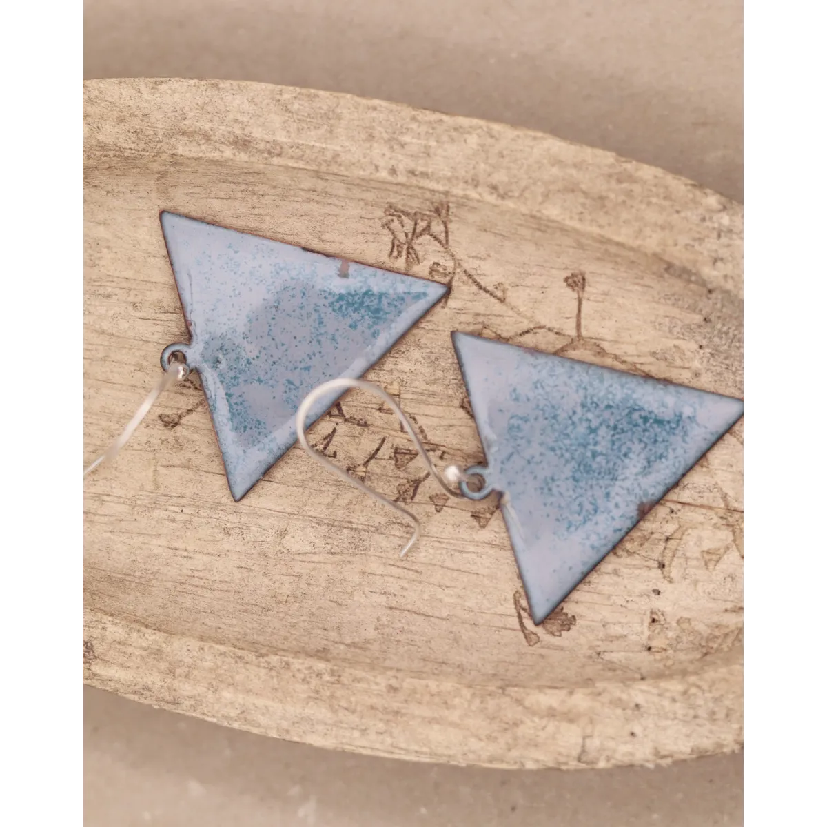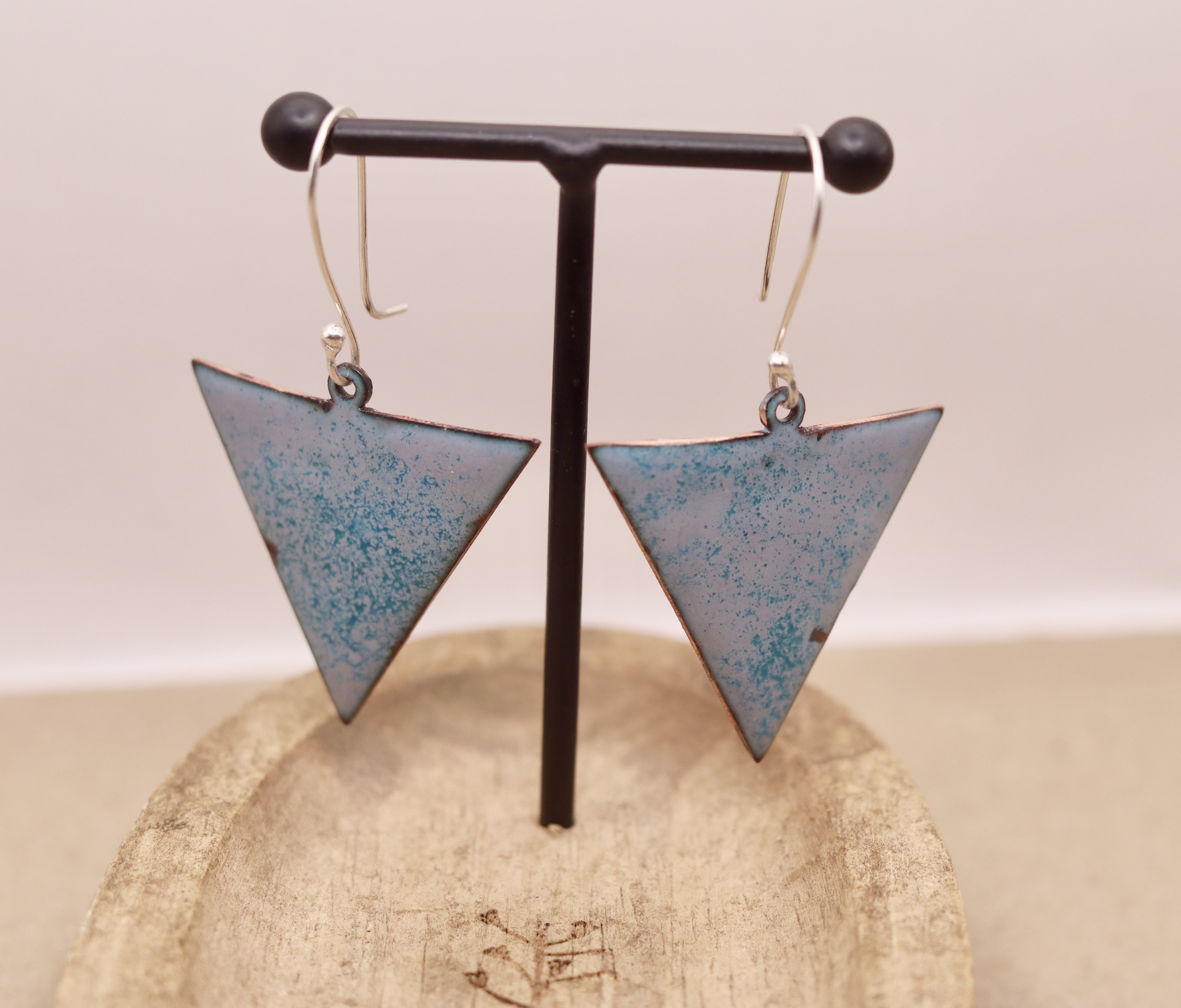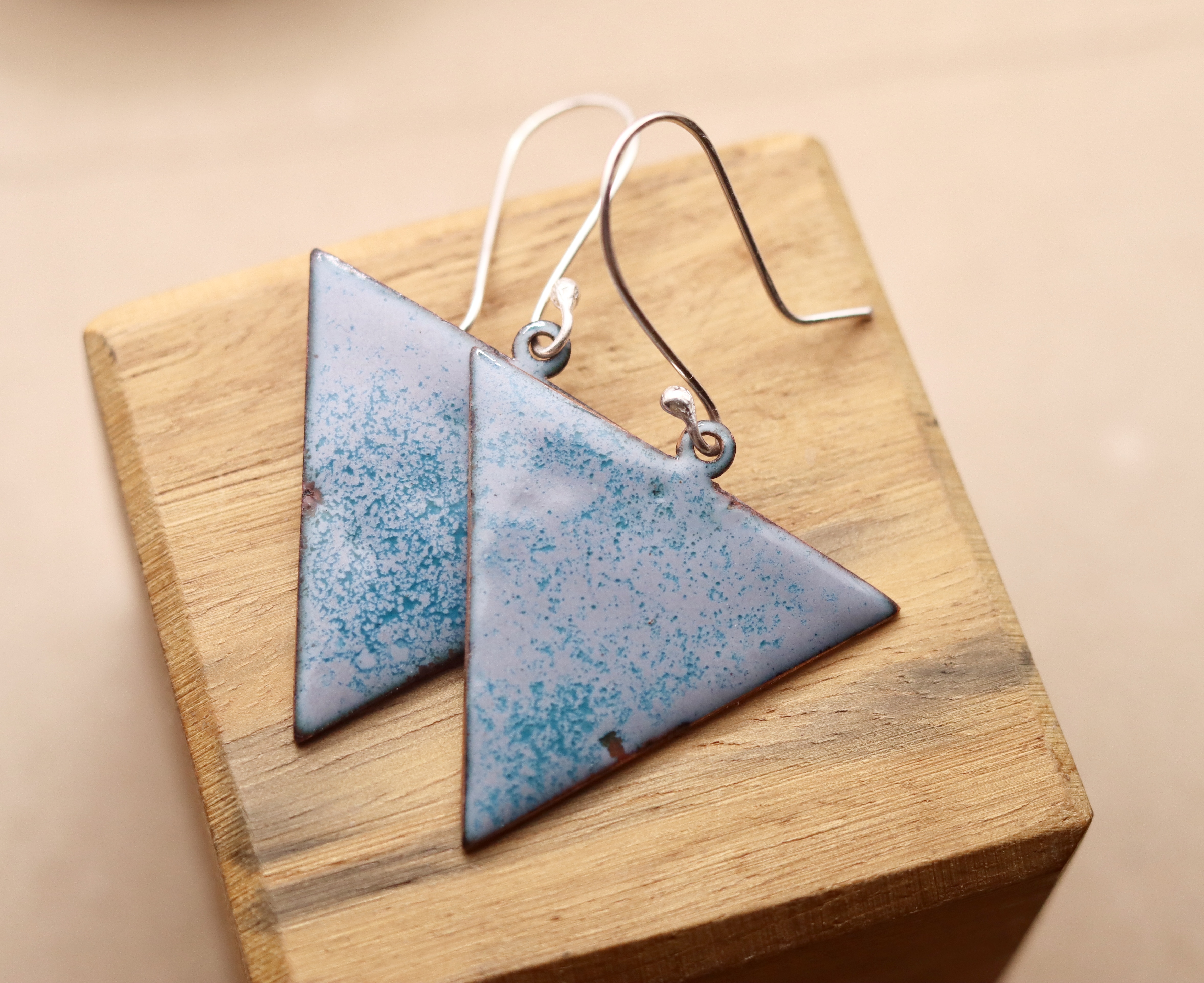 Triangle shaped enamelled earrings. Enamelled onto recycled copper. The ear wires are sterling silver.