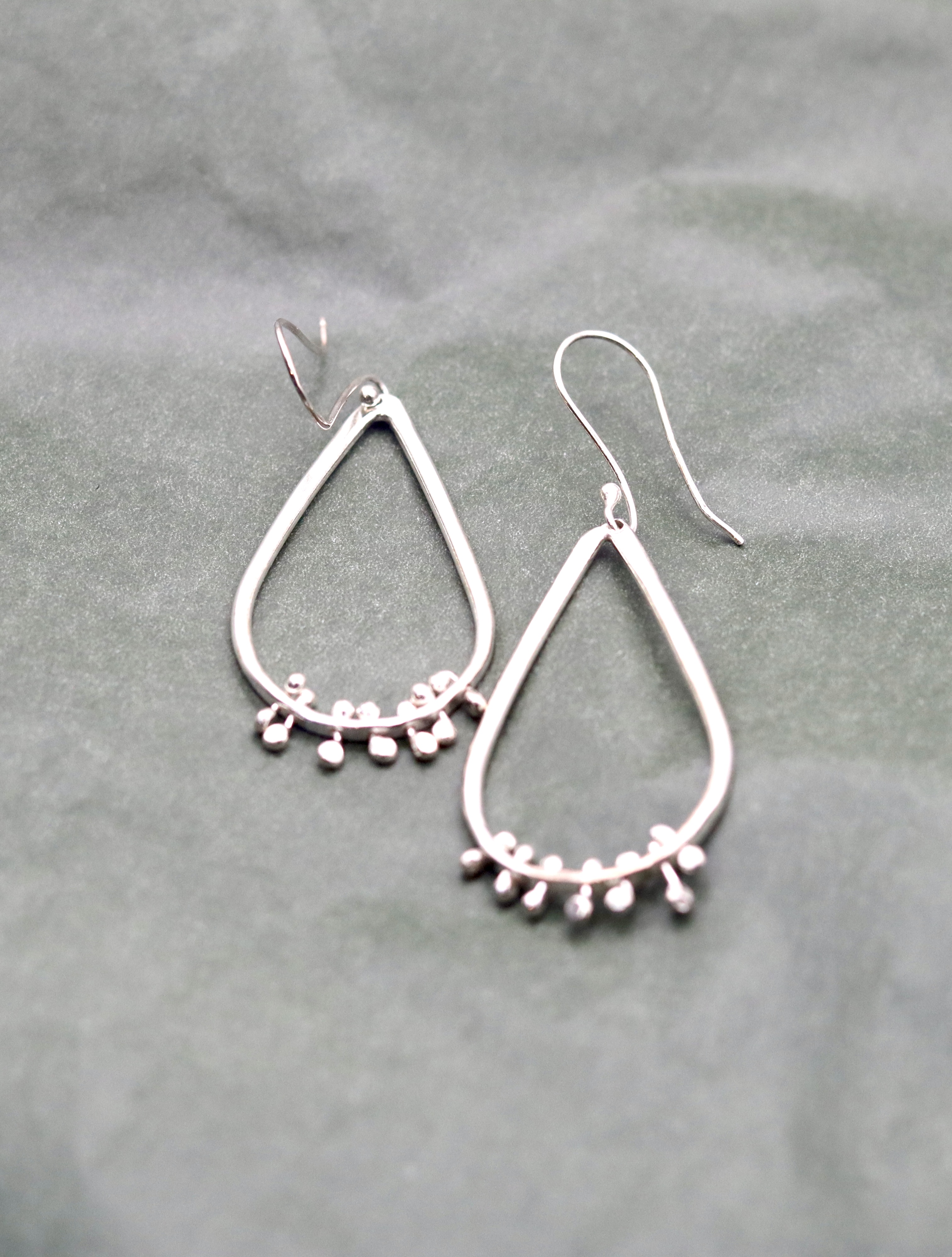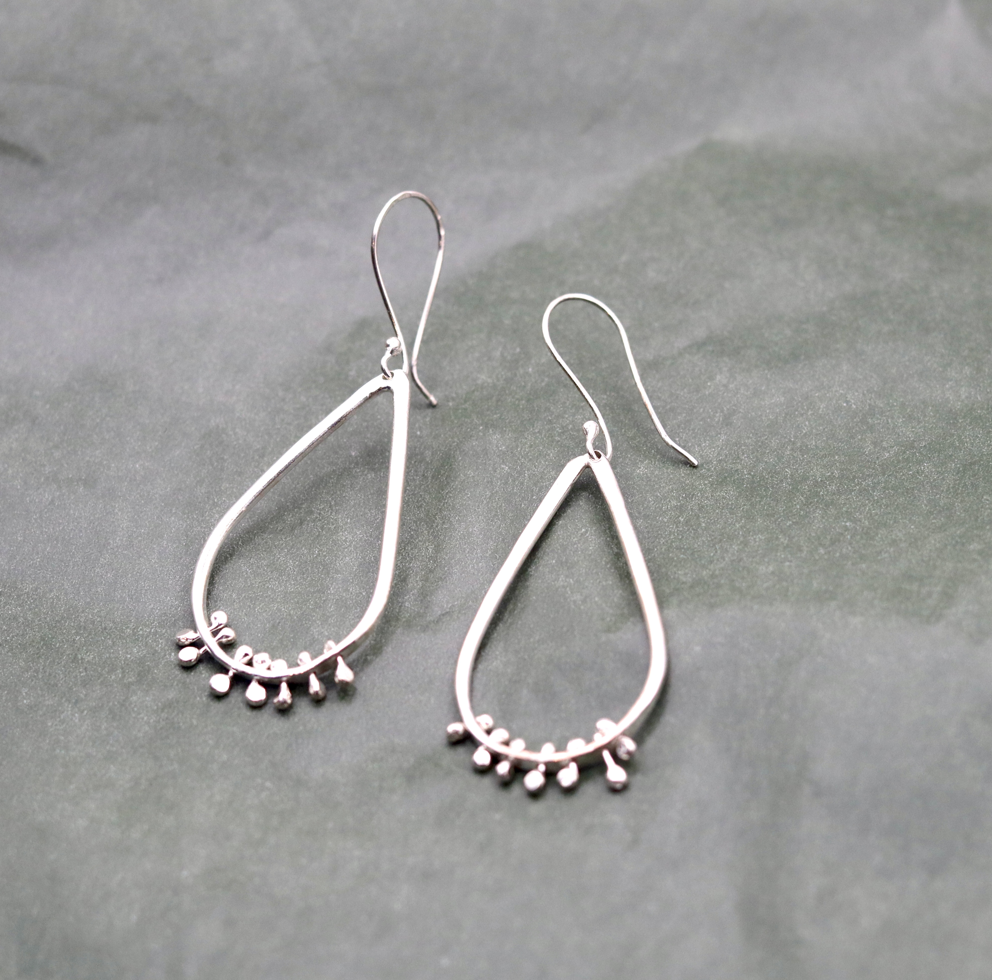 Very satisfying statement fidget earrings. Each pear shaped earring has lots of little barbell nuggets handing through the bottom of the earring. Look stunning on and great for fidgeting with whilst wearing them.