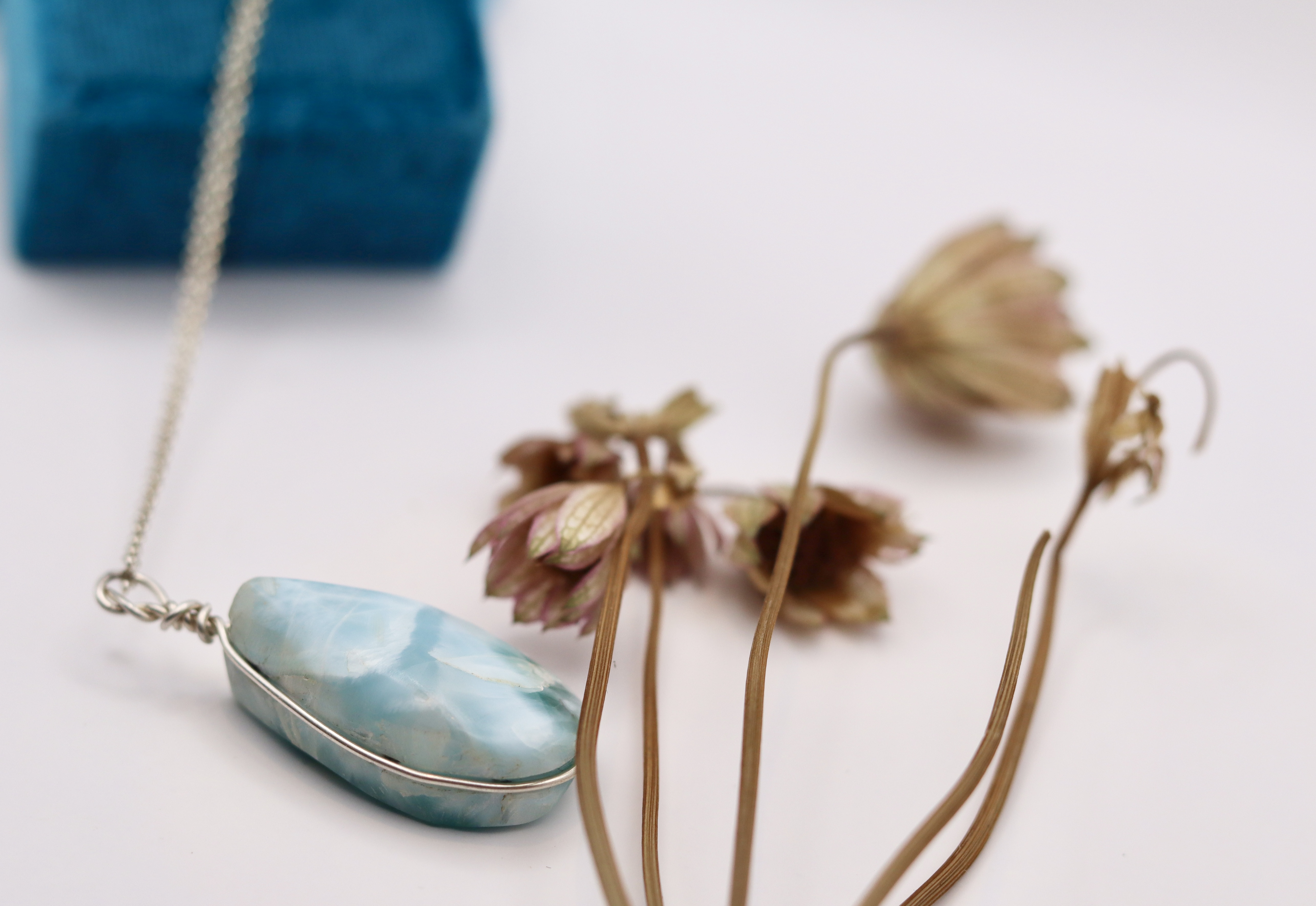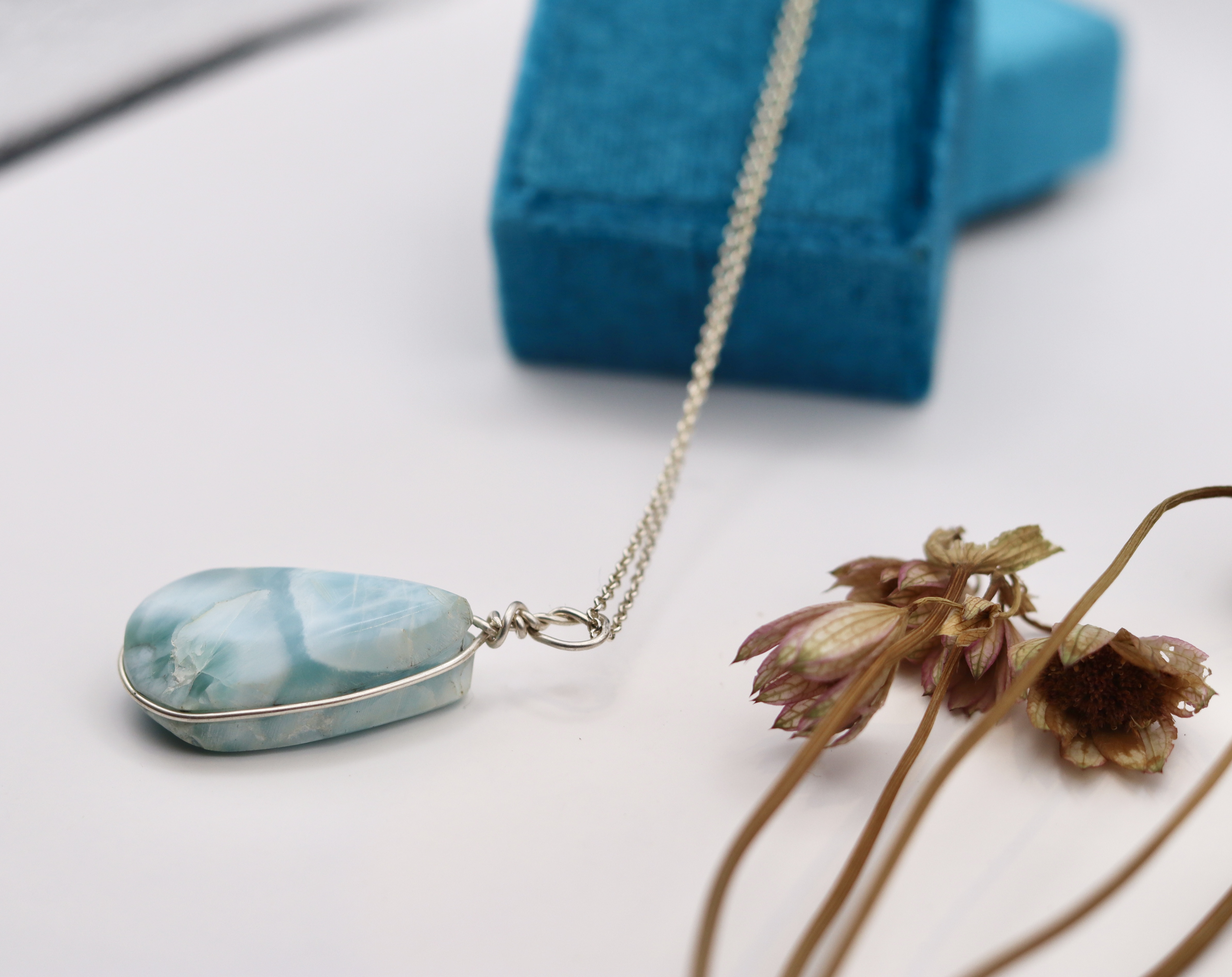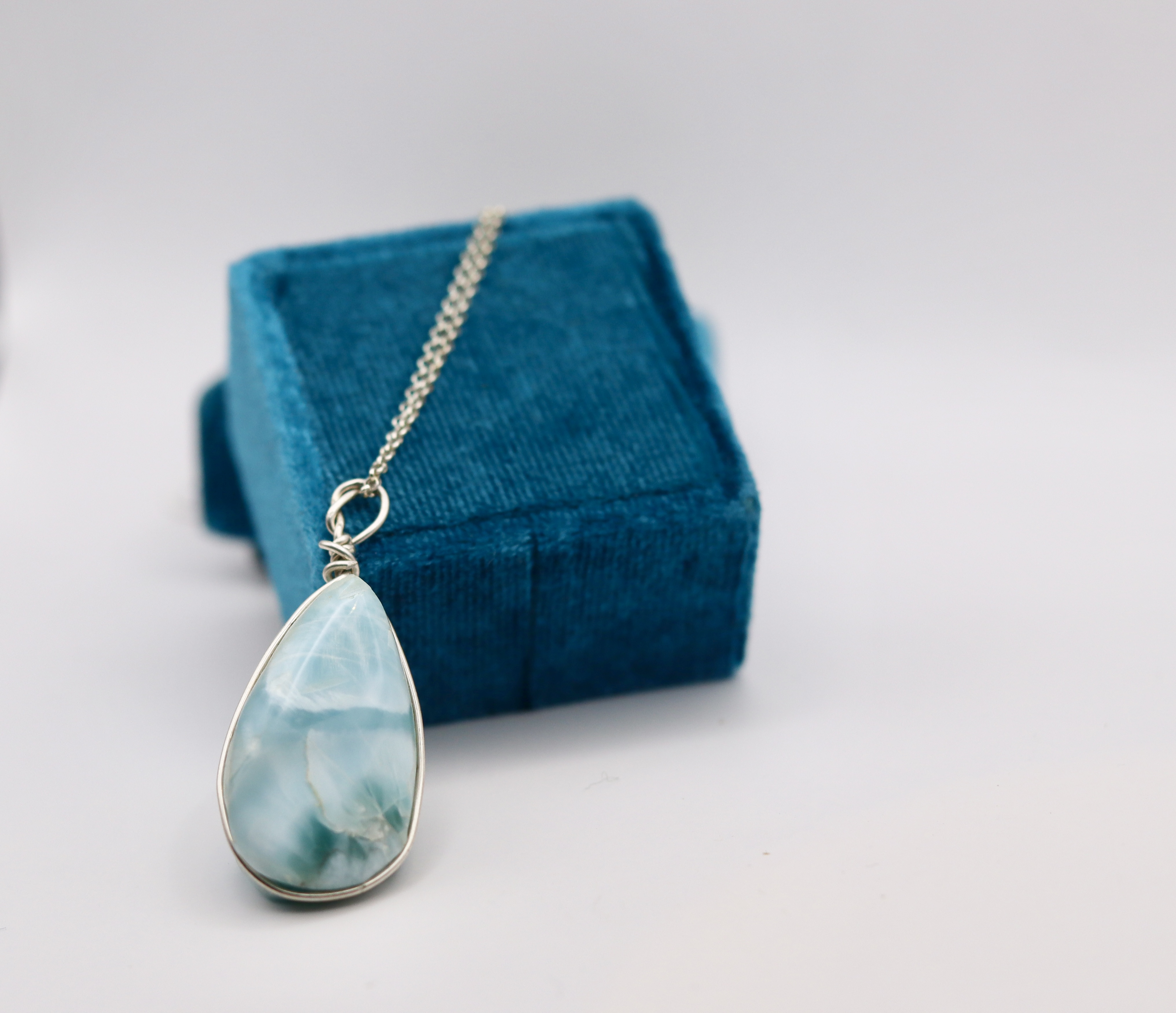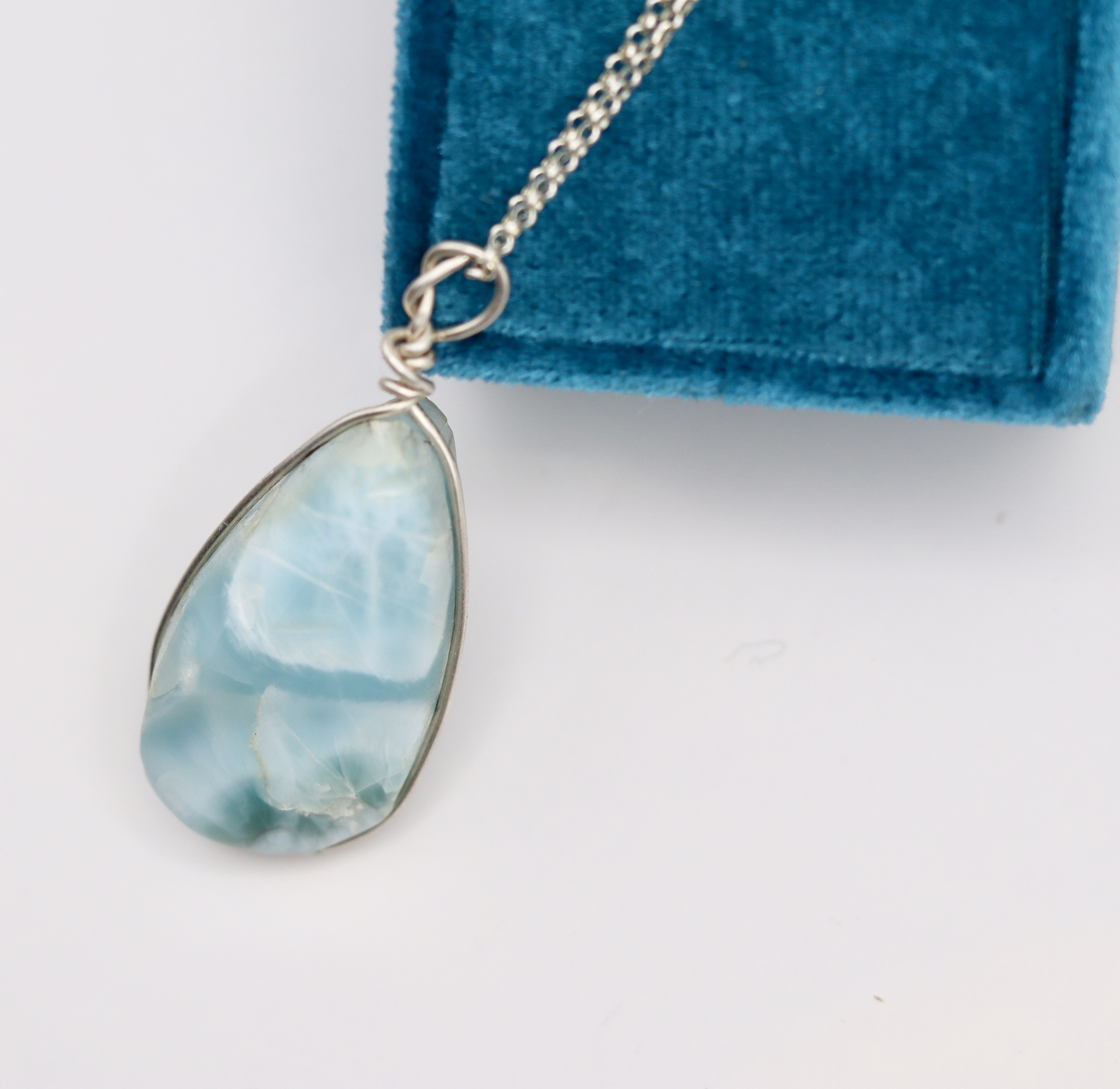 Larimar Necklace hanging from a sterling silver chain